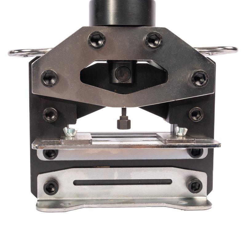 • Максимальная ширина шины: 150 мм • Максимальная толщина шины: • медная: 10 мм / алюминиевая: 12 мм • стальная: 6 мм • Тип лезвий: V-образный, гильотинный с высечкой • Возможность стационарного крепления пресса к рабочему столу • Рез шины без замятий и заусенцев • После резки шины образуется высечка шириной 9 мм • Самоцентрирующаяся конструкция ножа • Предназначен для поперечной резки шин • После резки шина не требует дополнительной обработки • Максимальное усилие: 20 т • Вес инструмента: 30.70 кг • Упаковка: деревянный ящик • Габариты упаковки: 625х300х215 мм